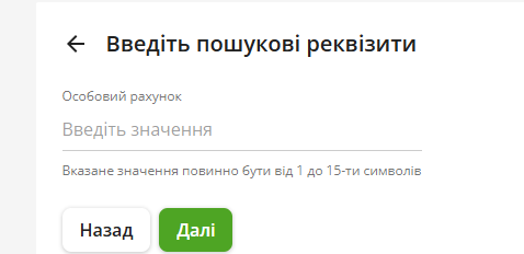 У полі «Особовий рахунок» необхідно ввести десятизначний «Код оплати» (дізнатися код можно на першій сторінці у Вашому особистому кабінеті, договорі або в заявці до договору). Натиснути «Далі».