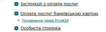 Потім в меню ліворуч «Оплата послуг банківською карткою» натиснути на пункт Поповнення через Приват24-поповнювати можна КАРТКОЮ БУДЬ-ЯКОГО БАНКУ